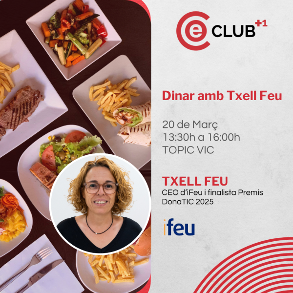 Comptarem amb Txell Feu, CEO d’iFeu, una empresa familiar que s’ha consolidat com a referent en infraestructures i solucions IT per a empreses. Actualment, iFEU té més de 500 clients actius i desenvolupa 50 projectes IT anuals, combinant tecnologia avançada amb proximitat i servei proper. La Txell encarna una manera de liderar que combina innovació tecnològica, visió de negoci i aposta per les persones. Defensora d’una mirada femenina en el sector de les TIC, posa l’accent en empatia, treball en equip i proximitat, demostrant que tecnologia i humanitat poden anar de la mà. Recentment, la Txell ha estat finalista dels Premis DonaTIC 2025, un reconeixement a la seva trajectòria i al seu compromís amb la visibilització del talent femení en el sector tecnològic. Data: Divendres, 20 de març Activitat exclusiva per a socis del Consell Empresarial d’Osona. Si encara no ets soci, escriu-nos a comunicacio@cedosona.org. Cost anual: 150 €.