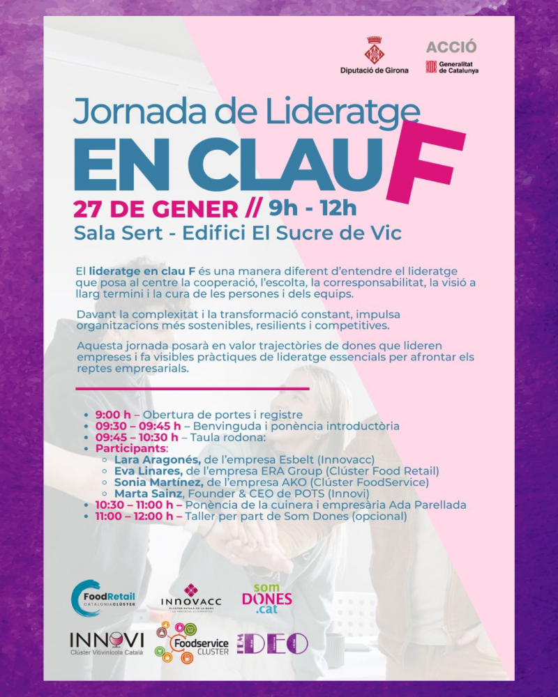 La jornada, que se celebrarà el 27 de gener de 9:00 a 12:00 a la Sala Sert de l’Edifici El Sucre de Vic, vol ser un espai de reflexió, aprenentatge i connexió, valorant experiències reals de dones que lideren empreses en sectors diversos i compartint pràctiques que transformen la manera de dirigir organitzacions. La jornada comptarà amb una taula rodona amb professionals de referència, on participaran Lara Aragonés d’Esbelt (Innovacc), Eva Linares d’ERA Group (Clúster Food Retail), Sonia Martínez d’AKO (Clúster FoodService) i Marta Sainz, Founder & CEO de POTS (Innovi), compartint les seves experiències en lideratge conscient i transformador. A més, inclourà la ponència d’Ada Parellada, cuinera i empresària, que mostrarà com aplicar els valors del lideratge en clau F en organitzacions reals, combinant cooperació, cura de les persones i visió estratègica. També hi haurà un taller opcional de l’associació SomDones, amb eines pràctiques de lideratge transformador aplicables al teu entorn professional. La iniciativa està organitzada conjuntament pels Clústers Food Retail, Innovacc, FoodService, Innovi, FEM DEO _ Dona Empresa Osona i l’Associació SomDones.cat. amb l’objectiu de visibilitzar i connectar dones en càrrecs de responsabilitat, compartir coneixements i promoure un lideratge conscient i transformador.